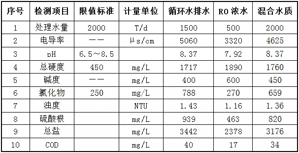 廠區(qū)內(nèi)現(xiàn)有項目產(chǎn)生的循環(huán)排污水和反滲透濃水均排入10000 m3/d污水處理廠內(nèi)處理。由于此部分水量較大,對污水處理站負(fù)擔(dān)大,且對水資源也是一種浪費。經(jīng)齊魯制藥相關(guān)技術(shù)人員化驗得知,此部分高濃度廢水電導(dǎo)率、硬度、濁度和鹽分較高,而COD較低,如果直接排入污水處理車間進(jìn)行處理不太合理,不僅會加重污水處理的成本,處理效果也不夠理想。