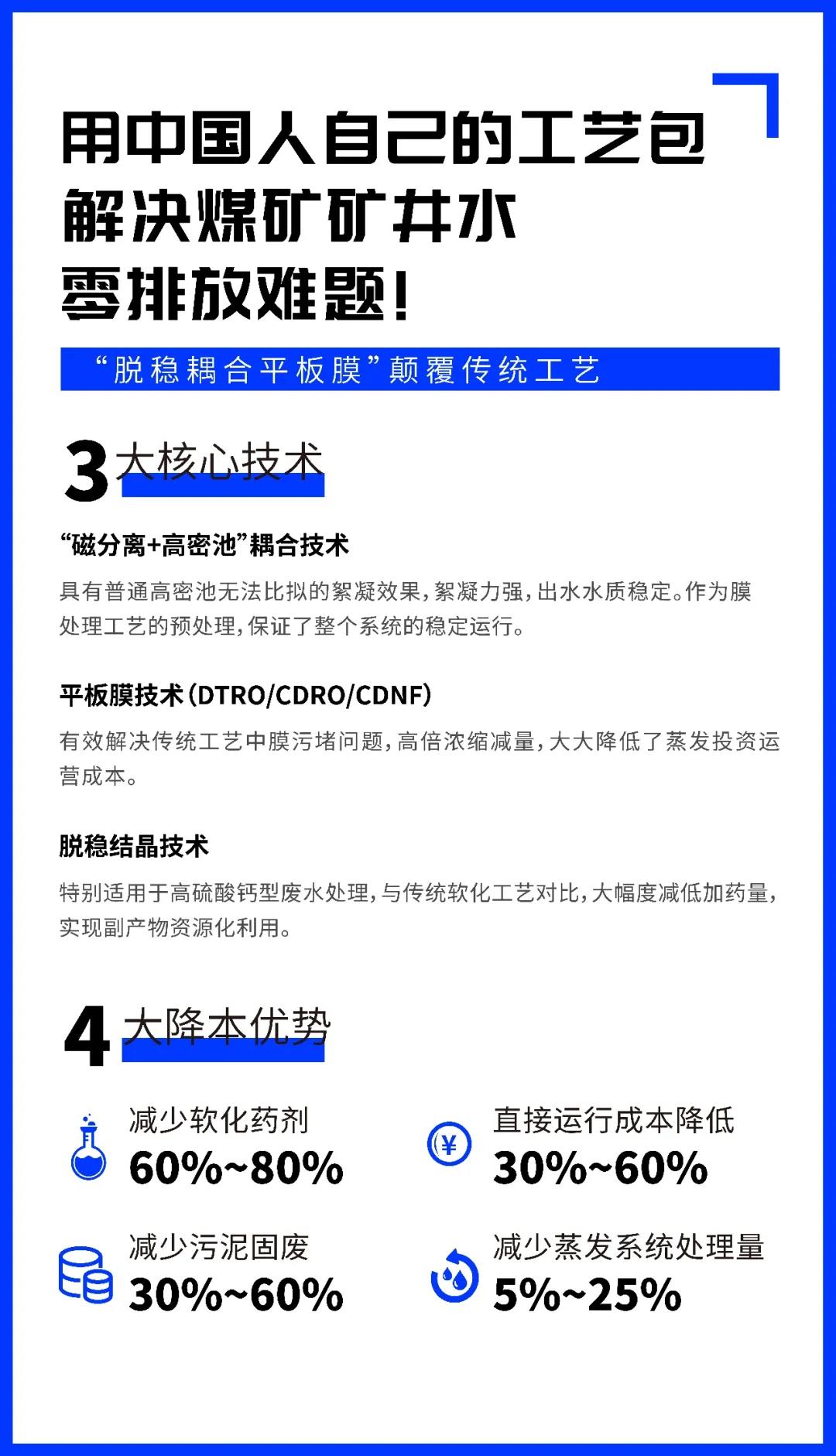 煙臺金正環?!懊摲€耦合平板膜法礦井水零排放集成裝備”入編煤炭行業,作為產業化示范裝備,成功應用在山能集團、陜煤化集團等多個大型礦井水零排放項目上,不僅實現礦井水資源化利用,而且真正做到了節能降耗,超低成本運營,徹底解決了傳統化學藥劑處理工藝弊端,高質量引領煤炭行業創新發展。